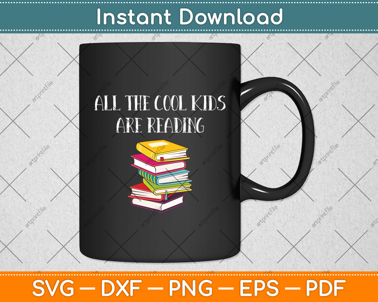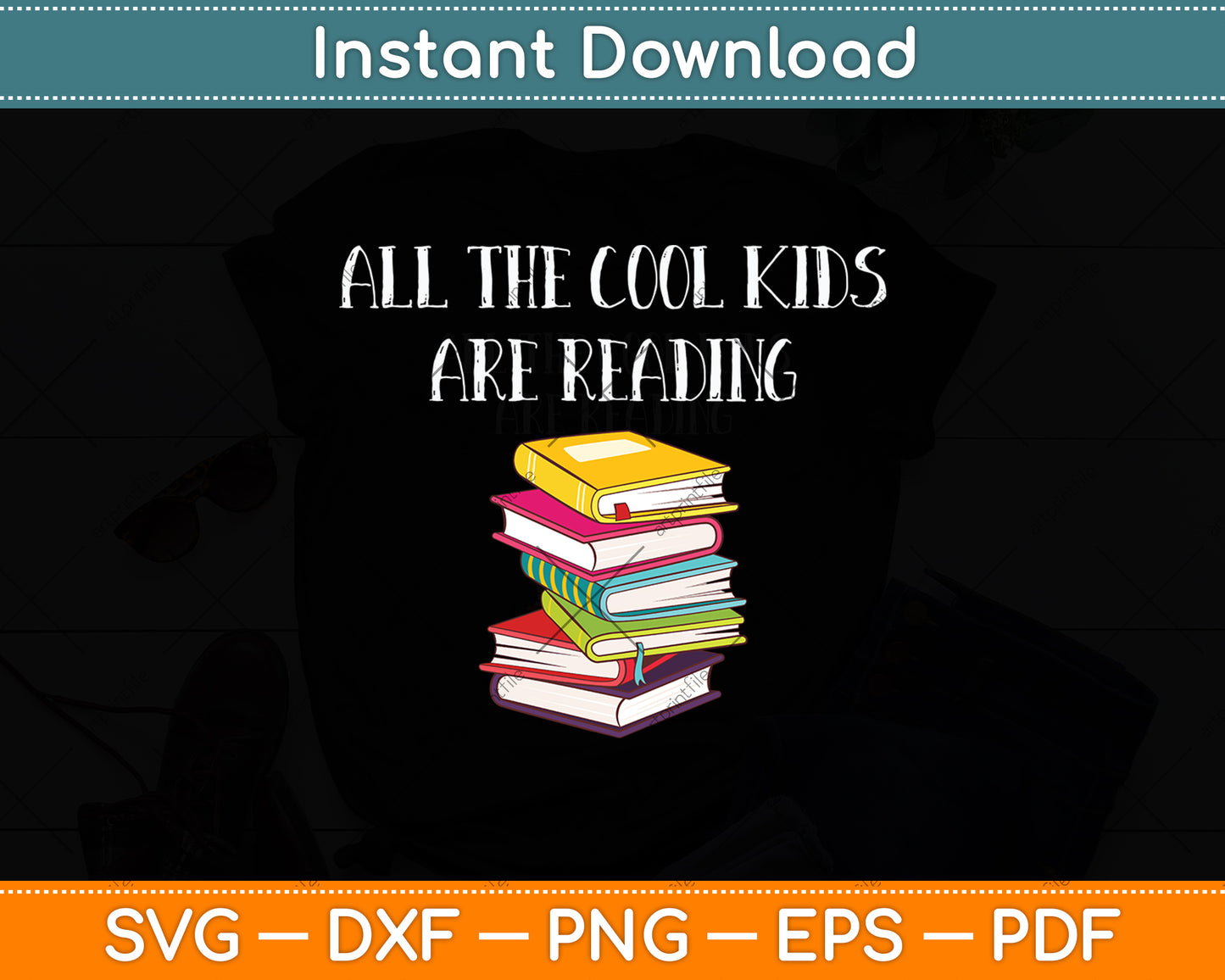 This cut file includes All The Cool Kids Are Reading SVG DXF PNG Design Digital Cutting files.