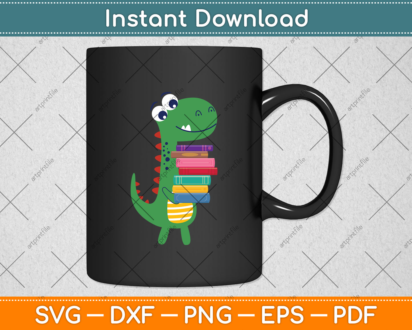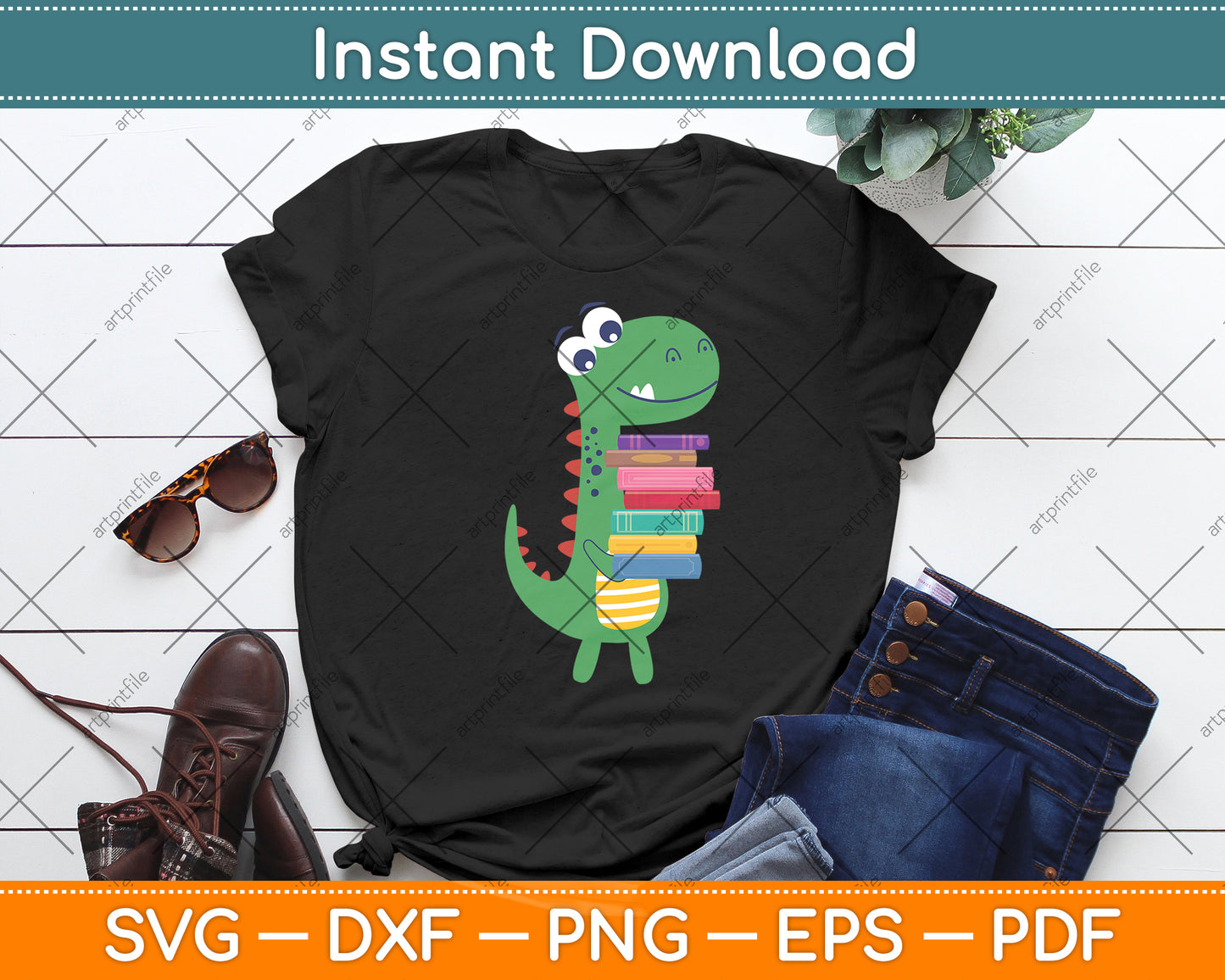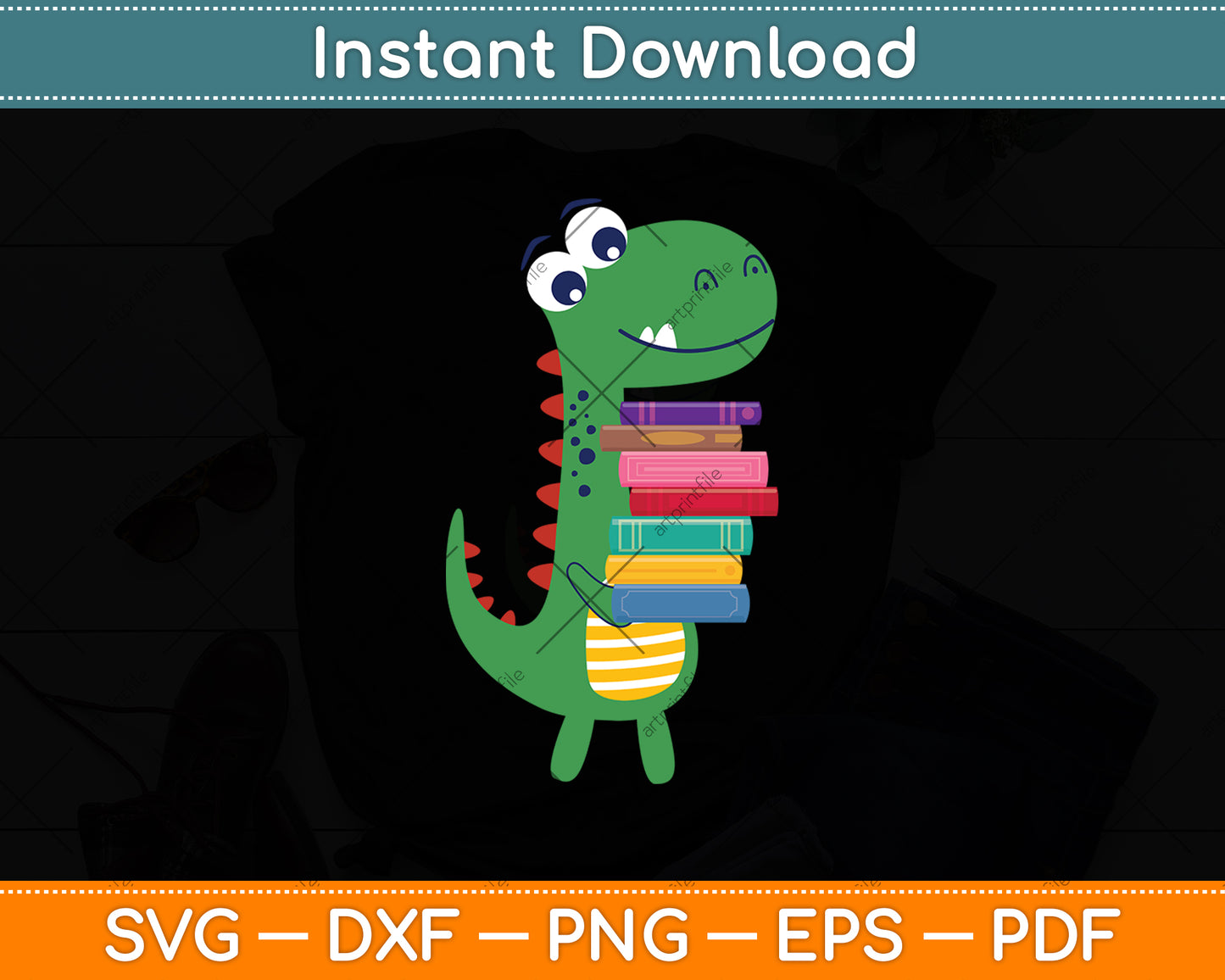 This cut file includes Dino Carrying Books Librarian SVG DXF PNG Design Digital Cutting files.