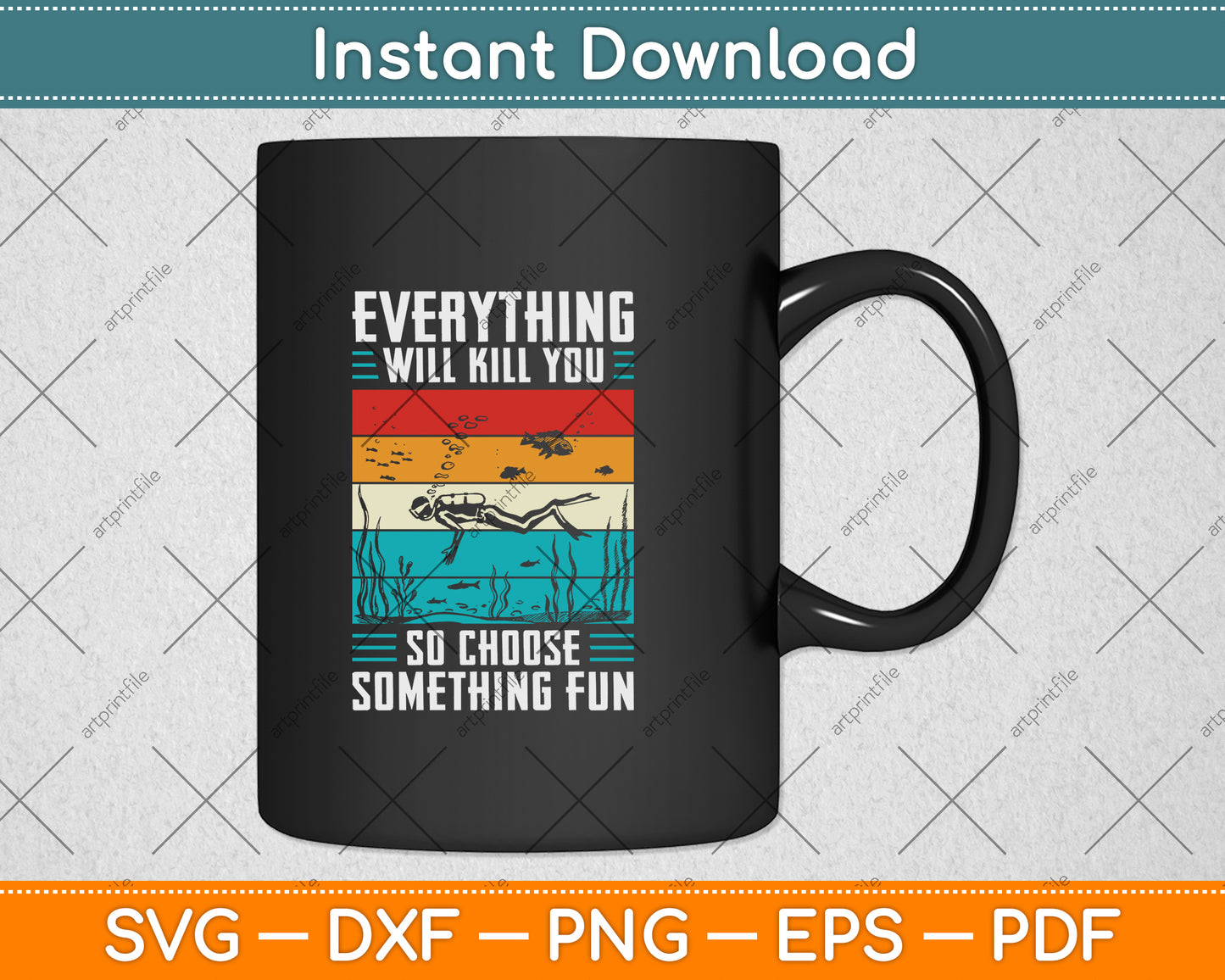 This cut file includes Everything Will Kill You So Choose Something Fun Scuba SVG DXF PNG Design Digital Cutting files.