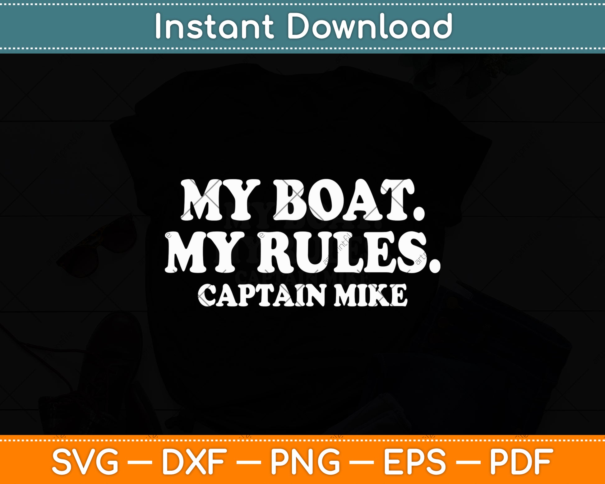 This cut file includes My Boat My Rules Captain Mike Personalized Boating SVG DXF PNG Design Digital Cutting files.