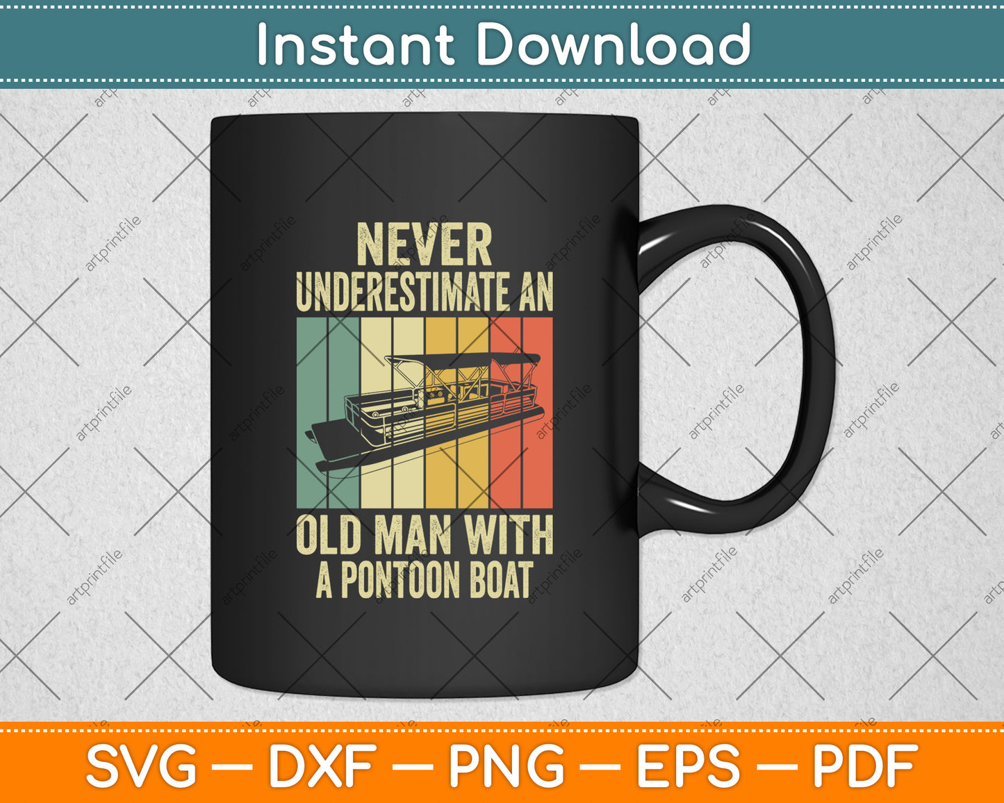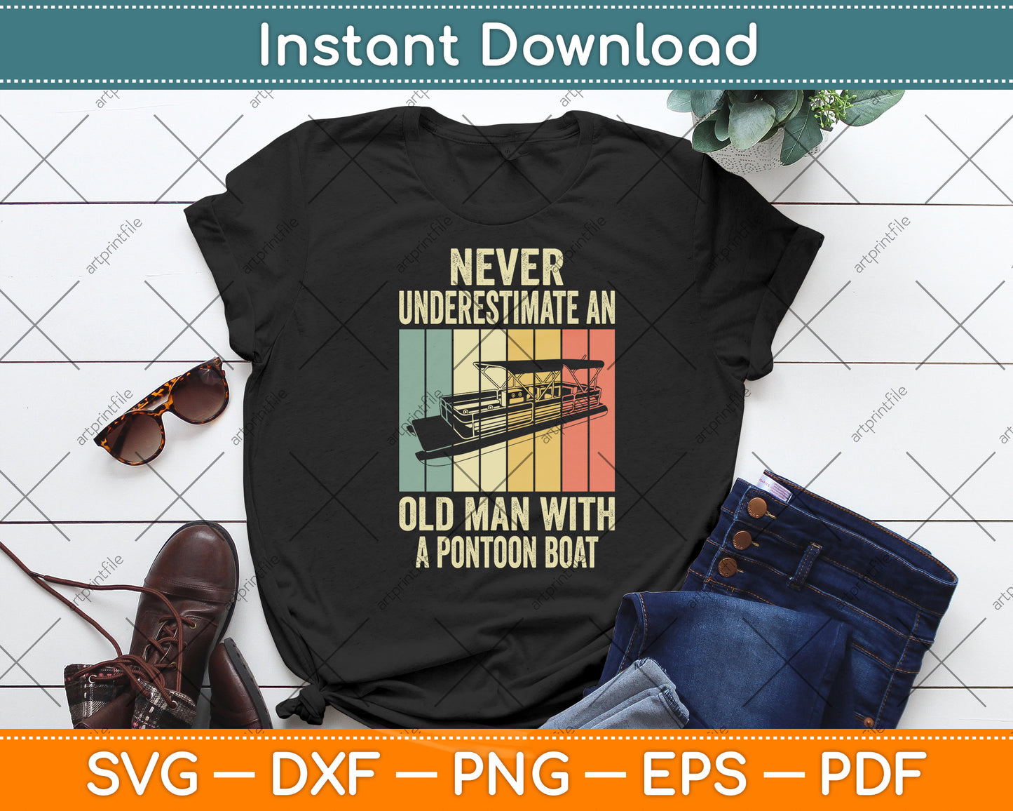 This cut file includes Never Underestimate An Old Man With A Pontoon Boat SVG DXF PNG Design Digital Cutting files.