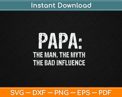 This cut file includes Papa The Man The Myth The Bad Influence Funny Dad SVG DXF PNG Design Digital Cutting files.