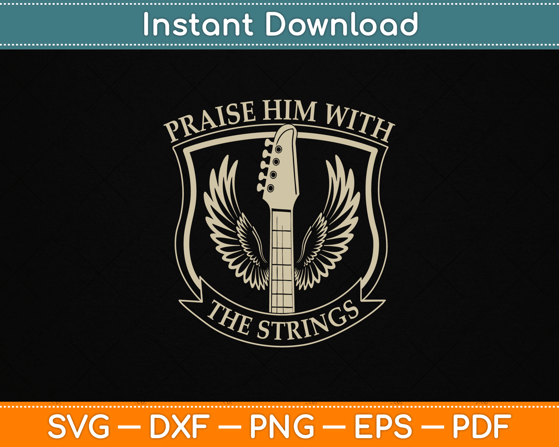 This cut file includes Praise Him With Strings Christian Guitar Psalm 150:4 SVG DXF PNG Design Digital Cutting files.